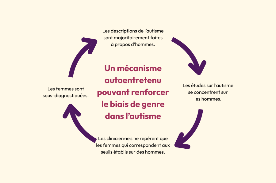 S’il y a des manifestations parfois différentes de l’autisme chez les hommes et les femmes, il faut noter qu’un biais de la part des clinicien·ne·s est possible. Adeline Lacroix pose l’hypothèse d’un mécanisme autoentretenu lié à un biais historique dans l’étude de l’autisme. Comme les premières descriptions de l’autisme ont été basées sur l’observation de jeunes garçons, les clinicien·ne·s n’ont pas toujours connaissance de l’existence de femmes autistes et pourraient avoir des difficultés à repérer ces dernières. On fait donc moins de recherche sur les femmes autistes de tout le spectre, et les femmes diagnostiquées sont celles qui correspondent aux seuils pensés pour les hommes. On pourrait donc passer à côté d’une partie du spectre de l’autisme. Dans son livre Autisme au féminin, Adeline Lacroix souligne que parmi les témoignages, une des caractéristiques communes à de nombreuses femmes autistes est d’avoir reçu des diagnostics psychiatriques erronés avant d’arriver sur la piste de l’autisme.