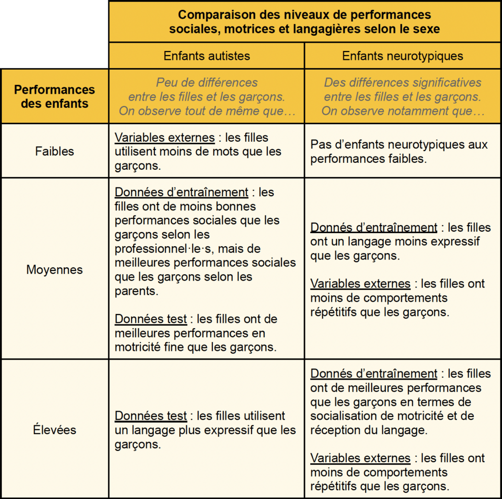 Chez les enfants autistes, les garçons avaient des scores inférieurs à ceux des filles dans le questionnaire de dépistage rempli par les parents. Cependant, dans 17 tests diagnostiques sur 18, les chercheur·euse·s ont noté qu’il n’y avait pas de différences significatives entre filles et garçons. La seule différence se trouvait au niveau des compétences dans la vie quotidienne, évaluées par les Vineland Adaptative Behavior Scales, où les filles avaient un meilleur score.